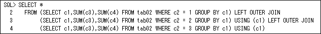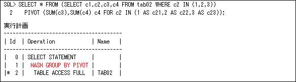 列が多い場合には、以下のように横展開する条件ごとにインライン・ビューを作成して行うのが効果的です。ただし、インライン・ビューの数だけテーブルをフル・スキャンする必要があります。これについてもパーティション化するかWITH句を使用すると気にする必要はありません(ただし、UNION ALLで説明したのと同じ問題があります)。これは、横展開する数(この例だとc2の数)が多いと、インライン・ビューの数が増えて記述が大変になりますので、列数が多いが横展開する数が少ない場合に使用することになると思います。