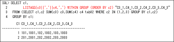 特殊な方法としてcsvファイルに出力する(カンマ”,”などで区切って並べた)イメージなどであれば、Oracle Database 11gR2からのLISTAGG集計ファンクションを使用するのも良いと思います。これはGROUP BY列の値が同じ行に対してメジャー列をWITHIN GROUPで指定した順に区切り文字で横並びにしてくれます(このときソートしない場合はORDER BY NULLにします)。以下の例では、列c1の値が同じ行に対してメジャー列”c3||’,’||c4”を列c2の昇順に区切り文字’,’で区切って横に並べます(メジャー列には1つの列しか指定できないので、複数列指定する場合には文字列連結演算子”||”で列を結合します)。