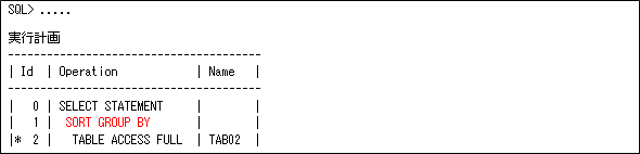 実行計画は以下のようにSORT GROUP BYとなります(これは、ORDER BY NULLにしても変わりません)。