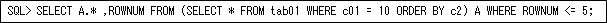 ある条件で通番を振るような場合もよくありますが、これも少々難しいと思いますがどのように行っていますか。例えば、それぞれの値によって上位5件だけを繰り返しデータとしたいときなどがよくあります。このときの上位5件をどのようにして求めるかですが、一般的には以下のようにソート後にROWNUM疑似列を使用して通番を振って求めます。