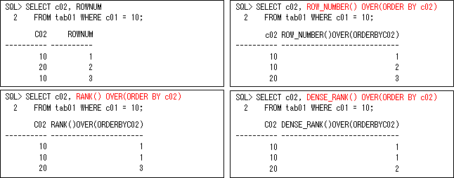 このような通番を振る処理についても、同じ値をどのようにするかなどによって難しくなってきます。そのため、ROWNUM疑似列を使用する以外に、様々なファンクション(ROW_NUMBER、RANK、DENSE_RANKなど)があるので知っておきましょう。これを上手く使い分けることで、もっと効果的に処理できるようになると思います(行いたいファンクションが存在しないかを確認してから、PL/SQLなどで作成するようにしましょう)。