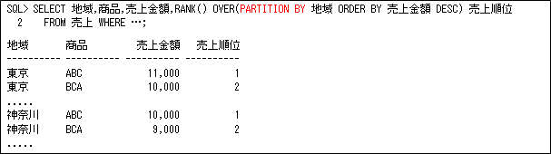 更に、QUERY_PARTITION句を使用すると、指定列ごとに通番を振ることが可能ですので、使用できる用途も多いと思います(以下の例は、売上データを地域ごとに商品の売上順位を出力します)。