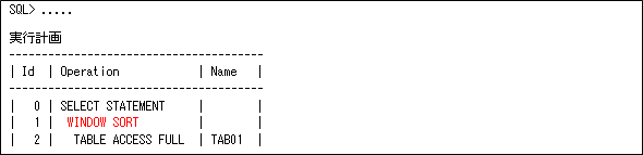 このような分析ファンクションを使用すると、実行計画は以下のようにWINDOW SORTとなります。分析ファンクションでは、ANALYTIC句(OVERのカッコ内)で定義された行のグループをウィンドウとして行います。これは、そのウィンドウ単位にソートしていることを意味します。