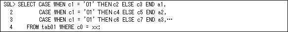 まずはCASE式から説明します。よくある例として、設定する値(計算式)が条件で異なる場合があります。このような場合は、一般的に以下のようにCASE式(またはOracle固有のDECODEファンクション)を使います。CASE式は非常に便利だと思いますが、列ごとに記述する必要があるため、同じ条件でも設定する列の数だけ記述する必要があります。例えば、以下のように列c1の値によってa1,a2,a3などに設定する値が異なる場合は、それぞれの列に同じCASE式(c1 = ’01’)を記述する必要があります。そのため、多くの列に条件で設定する場合はCASE式のオーバーヘッドが大きくなりますので注意して下さい(異なる条件判断であれば、どのようにプログラミングしても同じようになると思いますが、同じ条件判断ではCPUコストが多い条件判断をできるだけ少なくすることが重要です)。