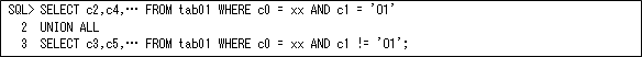同じ条件で設定する値が多い場合には、以下のようにUNION ALLを使用する方が条件指定がSELECT文ごとになるため、条件処理が緩和されます。ただし、UNION ALLはSELECT文の数だけテーブルのスキャンを行いますので、SELECT文が多い場合には注意が必要です。これについては、検索する単位にパーティション化すれば回避できますので(アクセス件数が少ない場合は索引でも回避できます)、使用するときは同時にパーティション化も検討するようにして下さい。