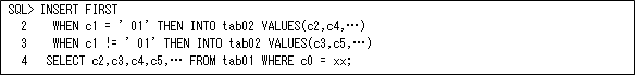 マルチテーブル・インサートは、条件によって複数のテーブルをインサートするようなときに使用しますが、これは同じテーブルにも使用できますので、覚えておくと便利かと思います。これは、テーブル・スキャンや条件チェックは1回で行うことが可能ですので(以下の例のようにFIRSTにすると条件チェックは一致したら終了しますが、ALLにすると常にすべての条件チェックを行います)、インサートする必要がある場合には最もオーバーヘッドが少ない方式になると思います。