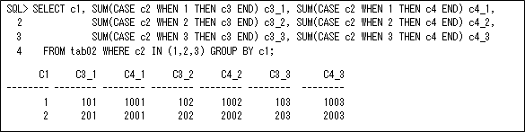 Oracle Database 11gからのPIVOT句を使用することでクロス集計(行を列に変換して集計する)問合せを記述することができます。これはPIVOT句で指定されている集計関数をPIVOT_FOR句の列に対してPIVOT_IN句の値ごとに列として実行することを意味します。以下の例では、列c2の値の1,2,3に対してSUM(c3)とSUM(c4)を行います。このとき列名が”<PIVOT_FOR句の別名>”_”<集計関数の別名>”になります(以下の例では、SUM(c3)は別名を指定していないので”<PIVOT_FOR句の別名>”だけになっています)。そして、PIVOT句で使用されていない列でGROUP BYが行われますので(以下の例では列c1になります)、集計するようなときはこれが最適だと思います(ただし、PIVOT句は記述が複雑なので慣れないと大変なところはあると思います)。