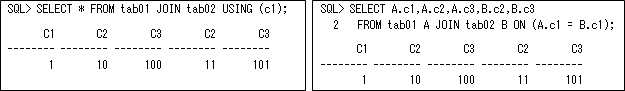 結合するテーブルの列数が多い場合はUSING句が便利ですので(視認性が良くなりますので)覚えておきましょう。このように横展開する場合に結合列は複数存在する必要がないため、以下(右)のように必要な列名だけを指定する必要があります。結合列名が同じ場合には、以下(左)のようにUSING句を使用すると簡略化できます(以下の例はどちらも同じように列c1が1つになります)。