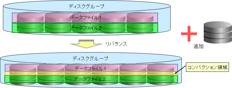 ASMでは、全体最適化のためにS.A.M.Eという考え方を行っていますので(詳細は第12回を参照してください)、常に最適化されていることを前提に動作します。そのため、領域の追加または削除を行うと最適化されていない状態になるため、それを調整するリバランス機能が必要になります。ただし、このリバランス処理には、AU単位に大量のデータ移動を行うので、オンライン処理中などはシステムにとって好ましくありません。そのため、リバランスの負荷(リバランス速度)とリバランス開始タイミング(変更時に自動/手動)を指定できるようになっています。また、単純にディスク上のデータサイズから分割するのでは、デーブルなどのオブジェクトが均等に分割されないので、以下のようにデータファイルごとのディスク・アクセスが均等になるように、メタデータを元に最小限のデータ移動で最配置します(つまり、対象ディスクを均等になるようにしますので、性能が異なると遅いディスクに引きずられます)。リバランス後に発生した未使用領域を詰める処理(コンパクション)も自動的に行うので、断片化も発生しないようになっています。