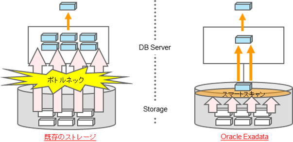 Oracle Exadata Database Machine(Oracleデータベース)用に開発したストレージになりますので、Oracleデータベースが性能向上するための様々な機能が実装されています。これは、サーバーとDASの構成でストレージとすることで、FlashカードをSmart Flash Log(REDOログ用)やSmart Flash Cache(データファイル用)などとして、効果的に使用することで高速化を行っています。I/O帯域幅の限界については、以下のようなスマート・スキャン(通常は左図のようにDBブロック単位にサーバーにデータを転送するが、右図のように必要な列と行だけを転送することでデータ量を削減する)などの転送量を削減する機能で解決しています。つまり、ストレージにOracleデータベース処理をオフロードすることで、高速化しているのが特長です(つまり、フル・スキャンにはスマート・スキャンなどを使用して、ランダムI/OにはSmart Flash Cacheなどを使用して、高速化しています)。