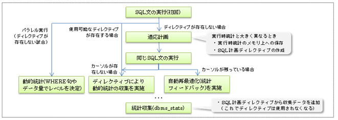 実行時の統計(カーディナリティなど)が見積もりと大きく異なると、実行時統計を次回以降で利用するようメモリ上に格納して、最適な実行計画を作成できるようにします(他のSQLでも改善されるようにSQL計画ディレクティブを作成して、ヒストグラムや拡張統計の欠落などを登録します)。ただし、共有カーソルがメモリ上に存在するときだけになります。これには、統計フィードバック(以前のカーディナリティ・フィードバック)とパフォーマンス・フィードバック(自動パラレル度の最適化)があります。