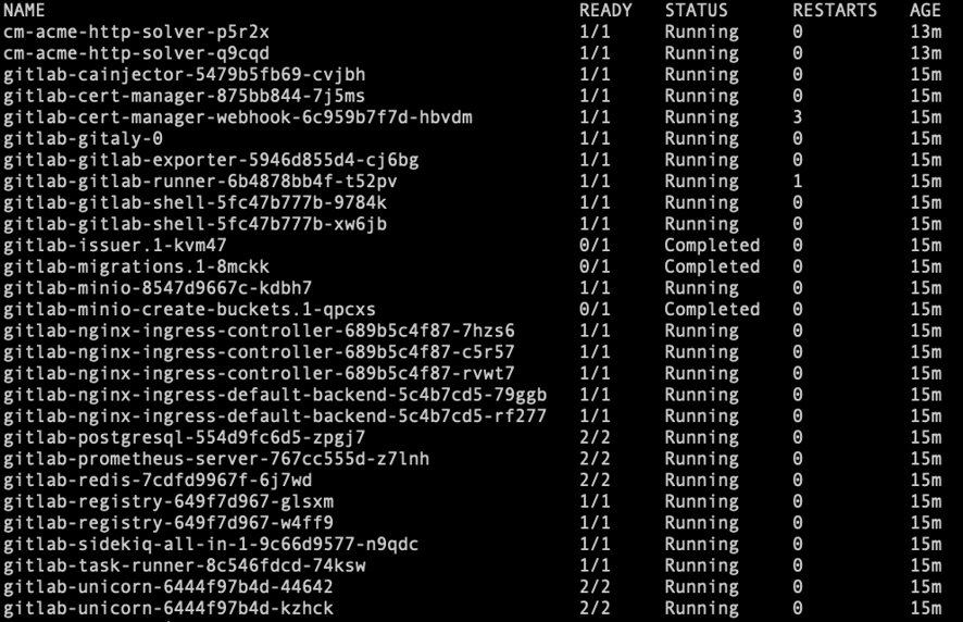 kubectl get secret <name>-gitlab-initial-root-password -ojsonpath='{.data.password}' | base64 --decode ; echo " - すべてのポッドが稼働するまで待ち、その後次のステップに進みます。以下のスクリーンショットは、Helmを通じてインストールされるポッドの一覧になります。