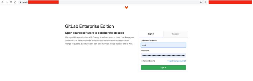 - ステップ1のDNSエントリ(例:gitlab.example.com)でGitLabを指定します。お使いのDNSゾーン管理サービスを使用して、DNSレコード・エントリを更新します。これを実施しないと、ステップ5にて「default backend – 404」というエラー・メッセージが表示されます。404エラー・メッセージが表示された場合は、DNSエントリを修正して、GitLab Runnerポッドを再作成します。