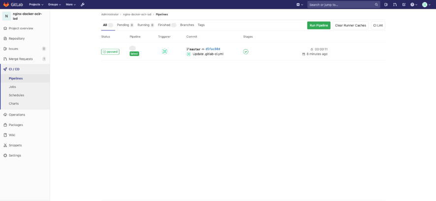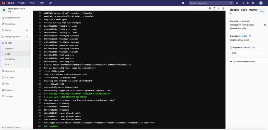これらのファイルを作成し、保存すると、GitLab Auto DevOpsによりパイプラインがトリガーされます。これにより、レジストリ・イメージがプルされ、新しいイメージが作成され、名前「$OKE_REGISTRY_NEW_IMAGE」を使用してそのイメージがタグ付けされて、レジストリにプッシュされます。