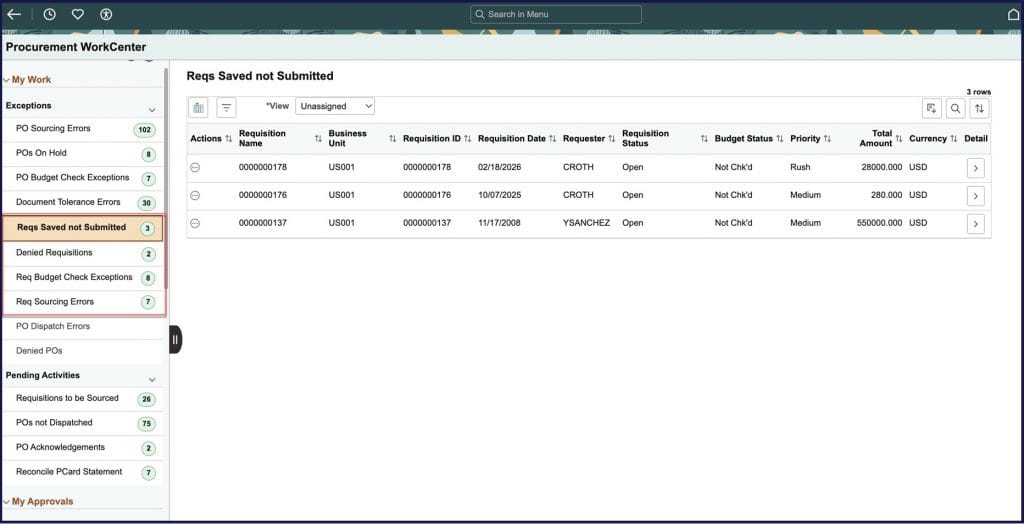 - Requisitions saved but not submitted: The requester saves the requisition but forgets to submit it leaving it in the ‘Open’ status- happens a lot more frequently than you would think