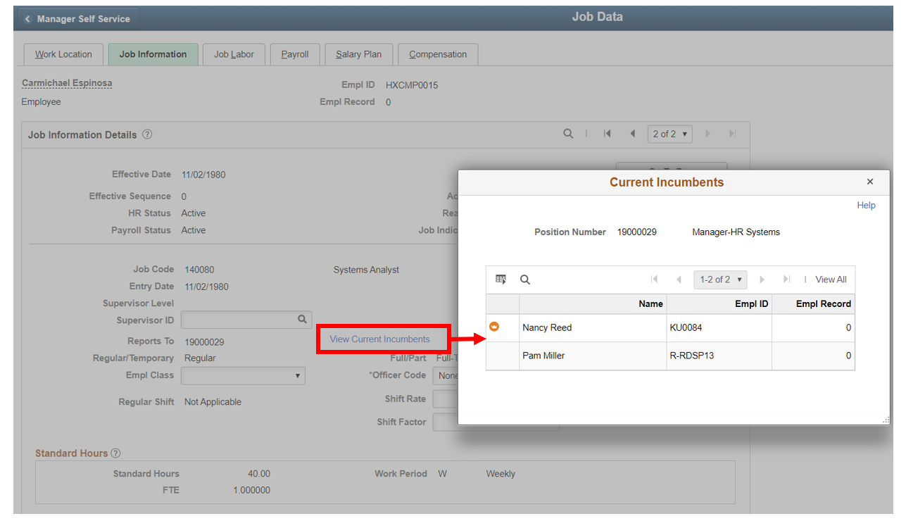 1. Review Primary Incumbent Details in Job Data and Position Data: The Reports To field on Job Data-Job Information page and Fluid Position Management-Position Data page will now allow Administrators to see the list of current incumbents along with Primary Incumbent information. Job Data-Job Information page shot: