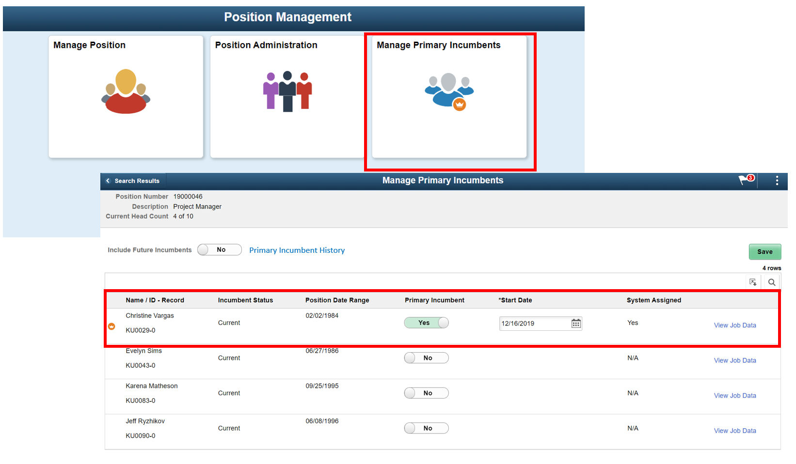 Note: Primary Incumbent status is updated automatically to ensure the system is able to find a manager while routing a transaction for approval. Based on the job movement of the employees, administrators should work with the business to review and update the Primary Incumbent information for a managerial position.