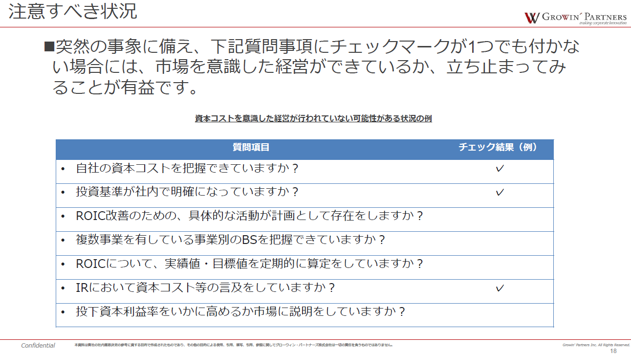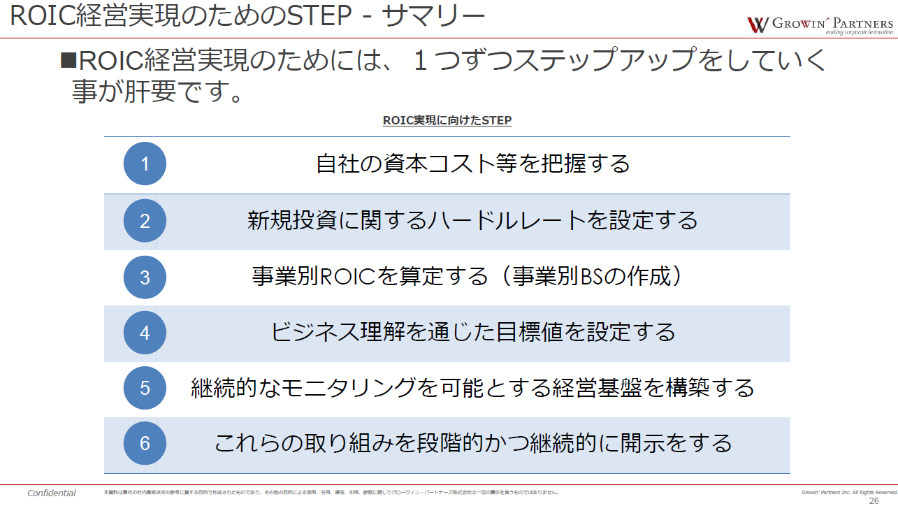 事業別ROICの実績値の算定をしたうえで、目標値の設定と継続的にモニタリングする経営基盤を構築して、これらの取り組みを段階的かつ継続的に開示をしていくのが具体的なステップになります。