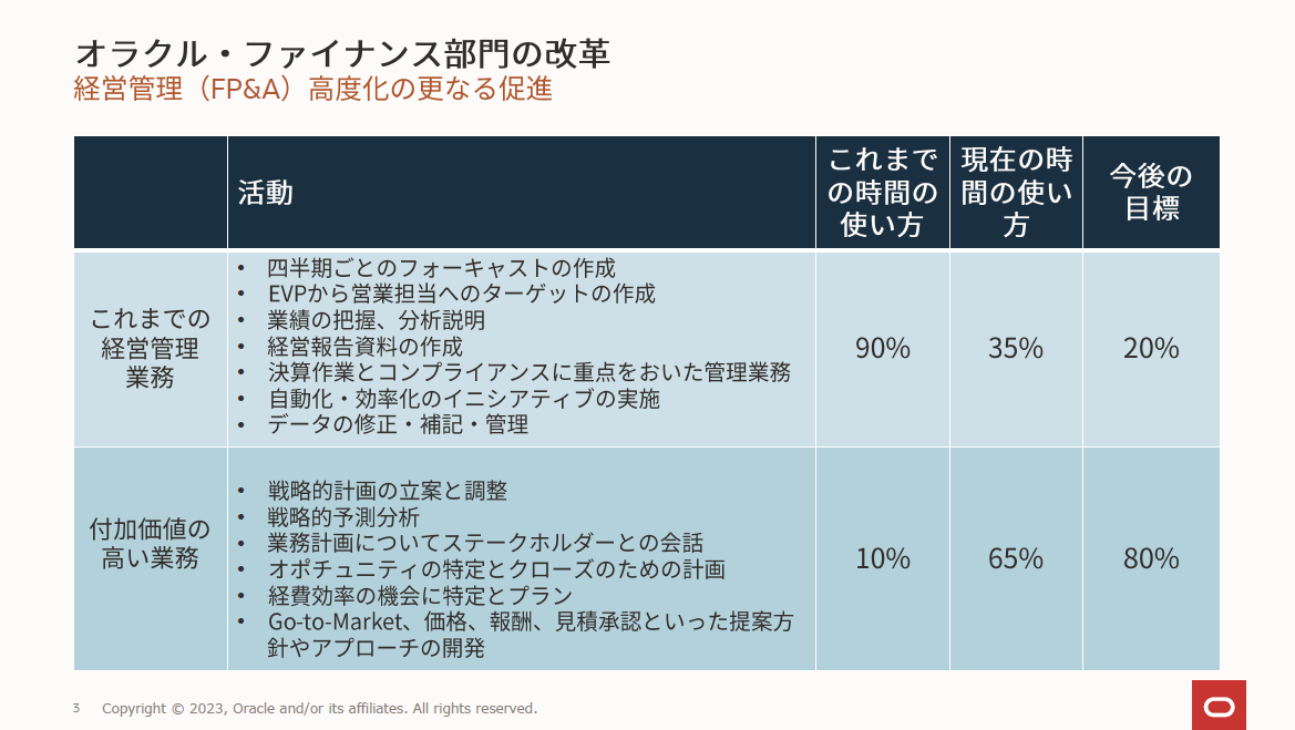 それを現在では約2/3の時間を分析や将来予測、アクションの共有といったFP&Aの業務に費やしています。弊社自身が自社製品であるCloud EPM Planningを活用し、このような変革を実現しております。