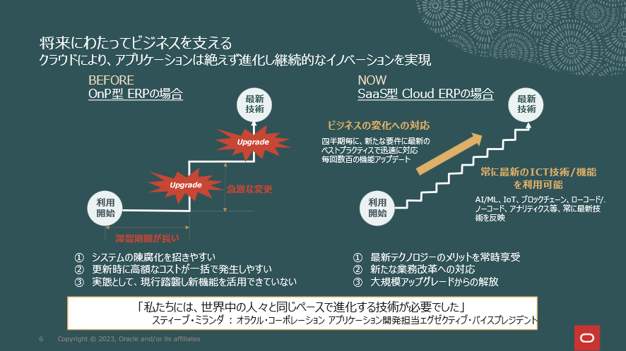 これまでのERPシステムは長期間使う中で5~7年単位でUpgradeして、新機能・テクノロジーを取り込んでこられたかと思います。現在ではSaaS型ERPで四半期毎に新機能やテクノロジーが組み込まれていくので、これらの最新機能を業務に即座に取り込んでいただいたり、ERP自体を進化させていくことが可能です。