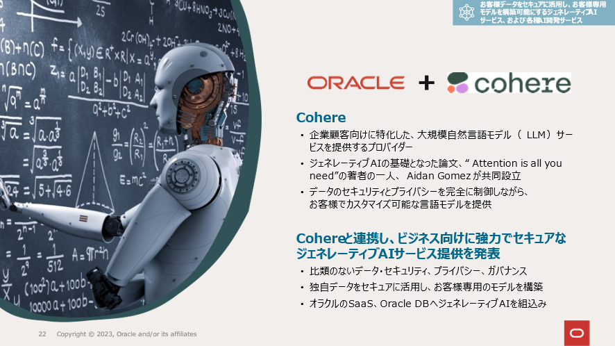 また生成AIに関してはエンタープライズ向けのResponsible AI(責任のあるAI)を提供されているCohere社との協業でサービスをリリースしていく計画で、既にHCM、ERP、SCMでいくつかのユースケースを発表しています。