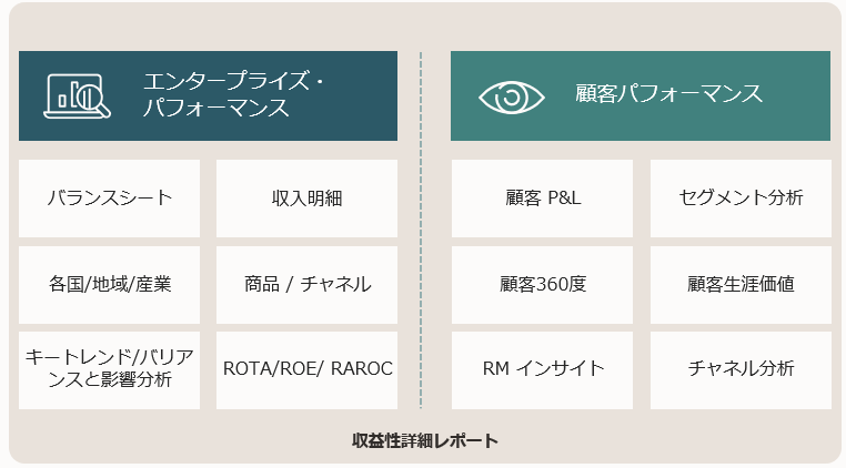 さてここから読者の皆様が、ある朝のALM委員会に参加したとしましょう。「事業ポートフォリオ変革」が重要なテーマになっています。皆様はどのようなデータを準備しますか?オラクルはグローバルのトップ銀行と組んで、意思決定に必要なデータをベストプラクティスとして提示していますので、ぜひ以下を参考にしていだければと思います。今回は特に「収益性管理」に焦点を当てます。