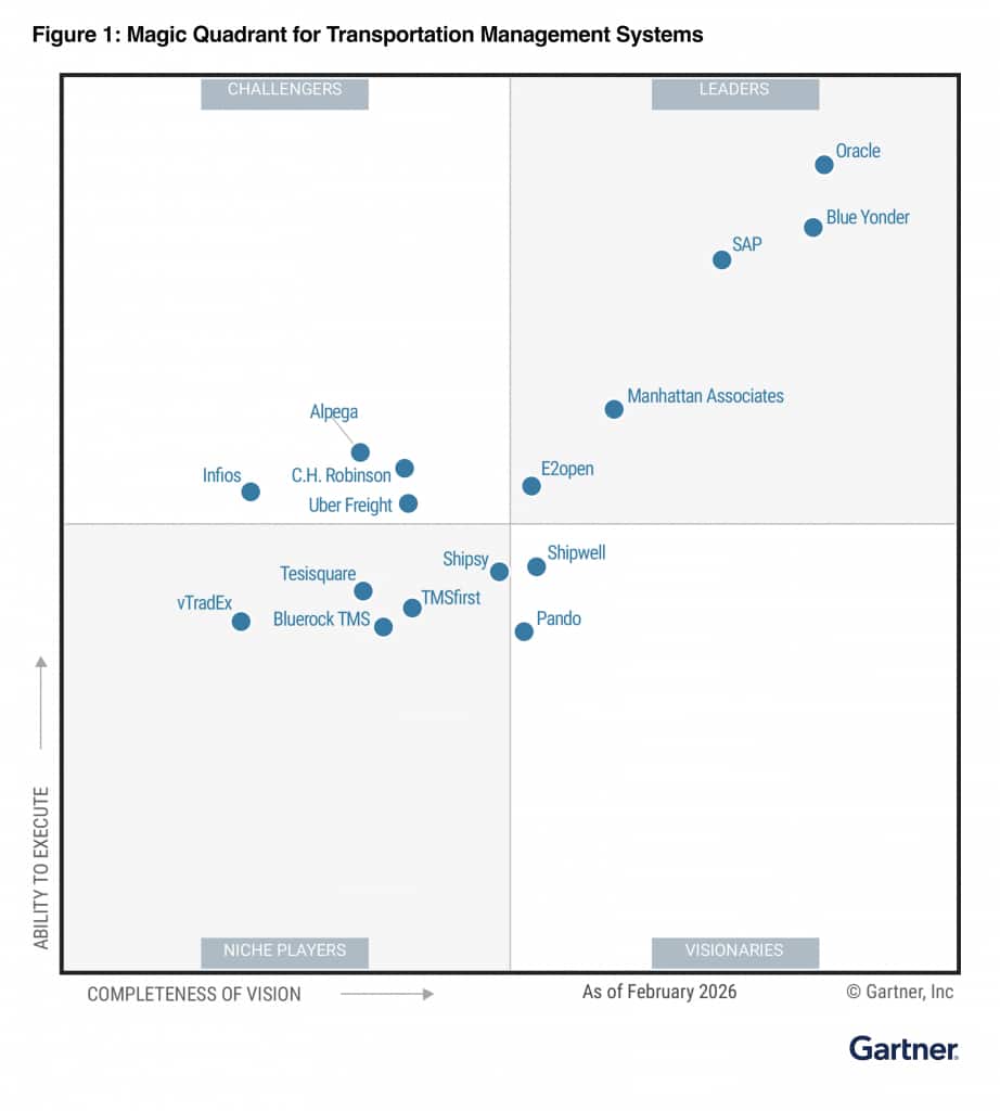 Gartner, “Magic Quadrant for Transportation Management Systems”; Brock Johns, Oscar Sanchez Duran, Manav Jain; 30 March 2026. This graphic was published by Gartner, Inc. as part of a larger research document and should be evaluated in the context of the entire document. The Gartner document is available upon request from Oracle. Gartner does not endorse any vendor, product or service depicted in its research publications, and does not advise technology users to select only those vendors with the highest ratings or other designation. Gartner research publications consist of the opinions of Gartner’s research organization and should not be construed as statements of fact. Gartner disclaims all warranties, expressed or implied, with respect to this research, including any warranties of merchantability or fitness for a particular purpose. GARTNER is a registered trademark and service mark of Gartner and Magic Quadrant is a registered trademark of Gartner, Inc. and/or its affiliates in the U.S. and internationally and are used herein with permission. All rights reserved.