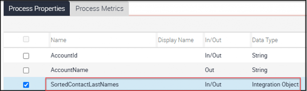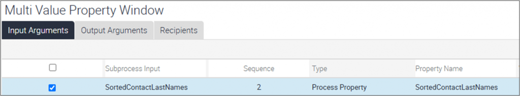 In this example, the SortedContactLastNames Process Property is set up in both the main process and the sub-process. This setup allows information to move back and forth between them. The property is listed as both an “In” and an “Out” property, which means you can send values into the sub-process and also get updated values back out. This is important for sharing information between the main process and the sub-process. In the child process, you just need to define the Process Property the same way.