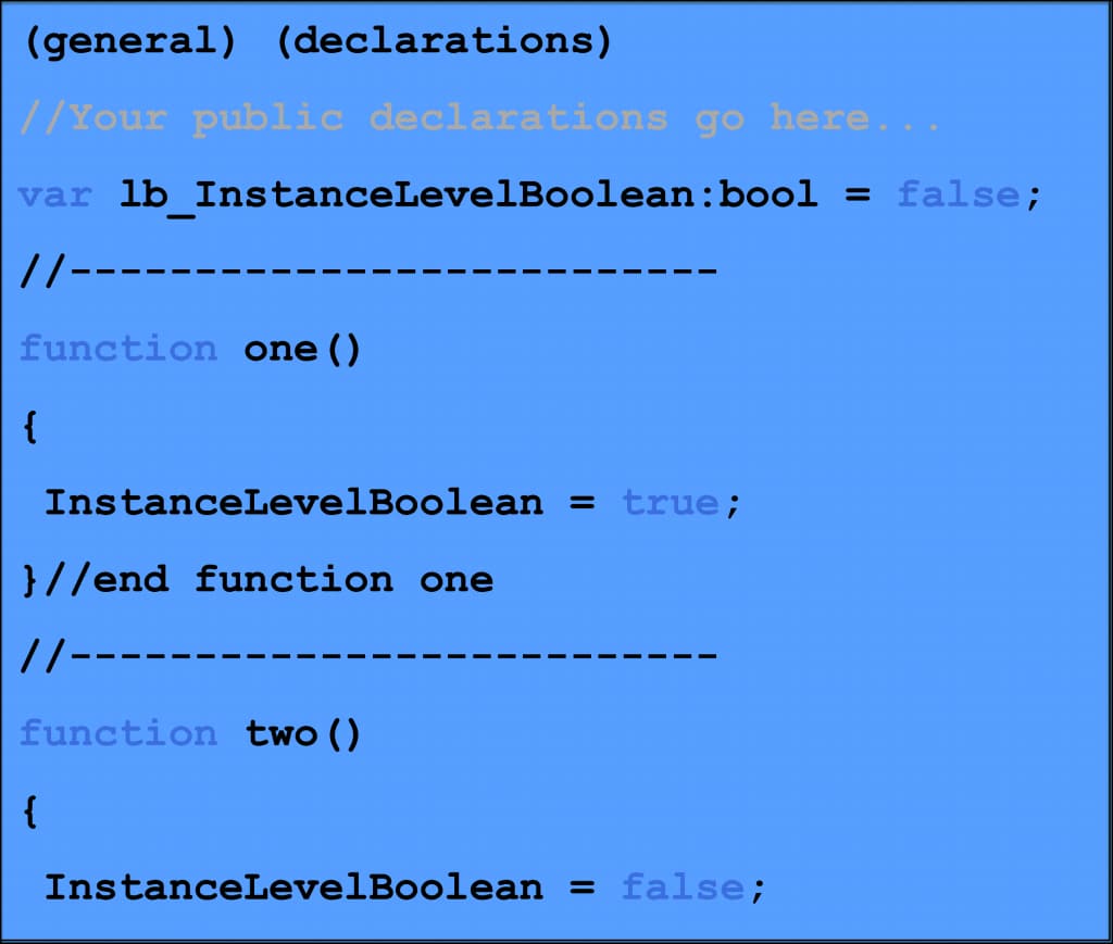 In a script, instance level variables are the variables you declare in the general declarations section of your code. This means any method in your object can see and update them. In workflows, these are called Workflow Process Properties. Every step in your Workflow Process can read from and write to these properties. You can also use them to pass information to sub-processes. They work the same way as instance variables do in scripts.