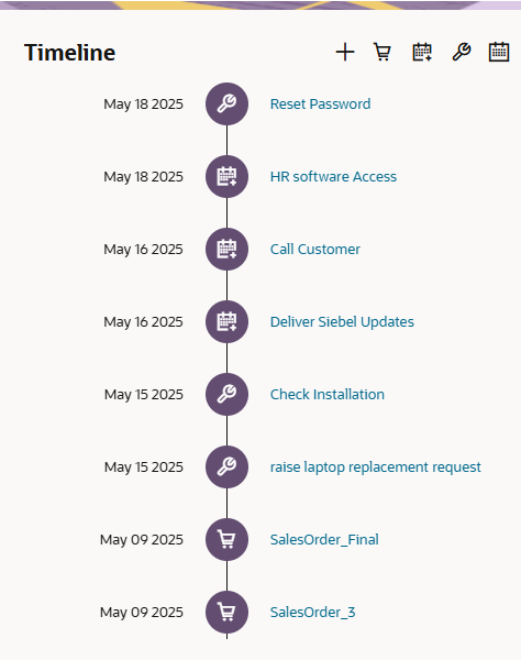 Siebel Timeline Control provides a comprehensive customer interaction timeline by allowing you to show data from several entities, including as Opportunities, Orders, SRs, Activities, etc., in a single timeline.