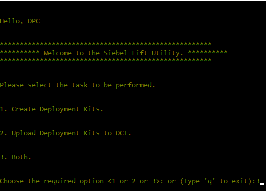 - The first choice is to create deployment kits; the second is to upload them to OCI; and the third is to carry out both tasks. Type 3 and Hit Enter.