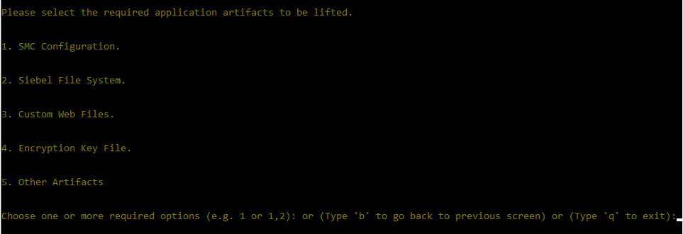 - When requested, provide all applicable values for the configuration of the Siebel Management Console (SMC), the Siebel File System, Custom Web Files, the location of the keyfile.bin file, and Other Artifacts.