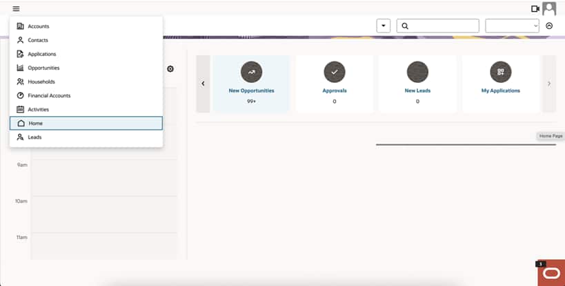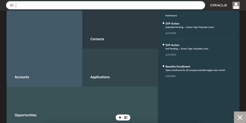 • Ask Oracle: A modern home and global navigation experience that enables users to search for screens and views, navigate key application areas, access tools, and receive alerts and notifications