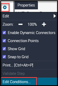 To implement this in a Workflow Process using Web Tools, select your connector and ensure its type is set to “Condition.” Then, click the gear icon and choose “Edit Conditions…”. Alternatively, you can double-click the connector to open the same dialog. This allows you to specify the criteria that determine when the branch will be followed.