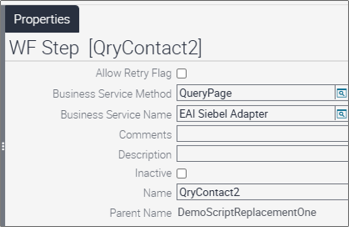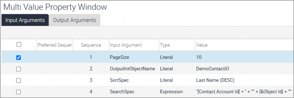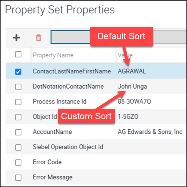 Note: While this approach enables sorting of Contact data, the results are returned in a Property Set. Currently, Workflow Processes and Business Services do not provide a straightforward way to iterate through the entire record set returned by EAI Siebel Adapter methods—you can access only the first record’s data. This limitation is recognized, and improvements to address it are being considered.