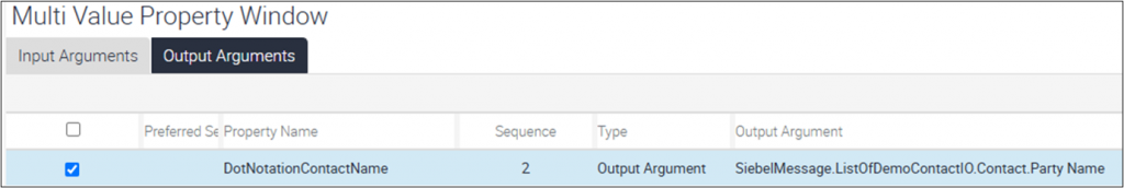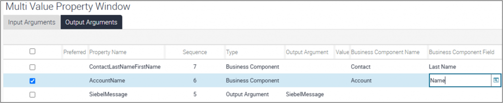 4. In the Output Arguments, I’ve included the result from the Contact Business Component as retrieved by the Workflow Process at its initiation. However, this value—stored in the ContactLastNameFirstName Process Property—will not reflect the sorted result and may not match our expectations. Its purpose is to highlight the difference between the result from the QueryPage method and the unsorted output. Additionally, I am retrieving the Account Name to confirm that we have the correct Account, and I am saving the result of the query in the SiebelMessage property.