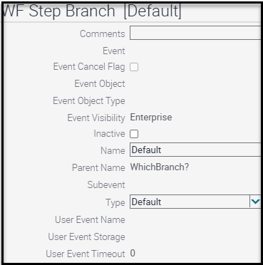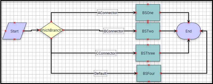 There are four connectors leaving the decision step, each leading to a distinct Business Service Step. All connectors, except for the Default branch, have identical conditions. The Default branch has no condition; it serves as the fallback path if none of the other branch conditions are met. In scripting terms, this is similar to the “default” case in a switch statement, the “Case Else” in a Select Case structure, or the “else” clause in an if/else if/else construct.