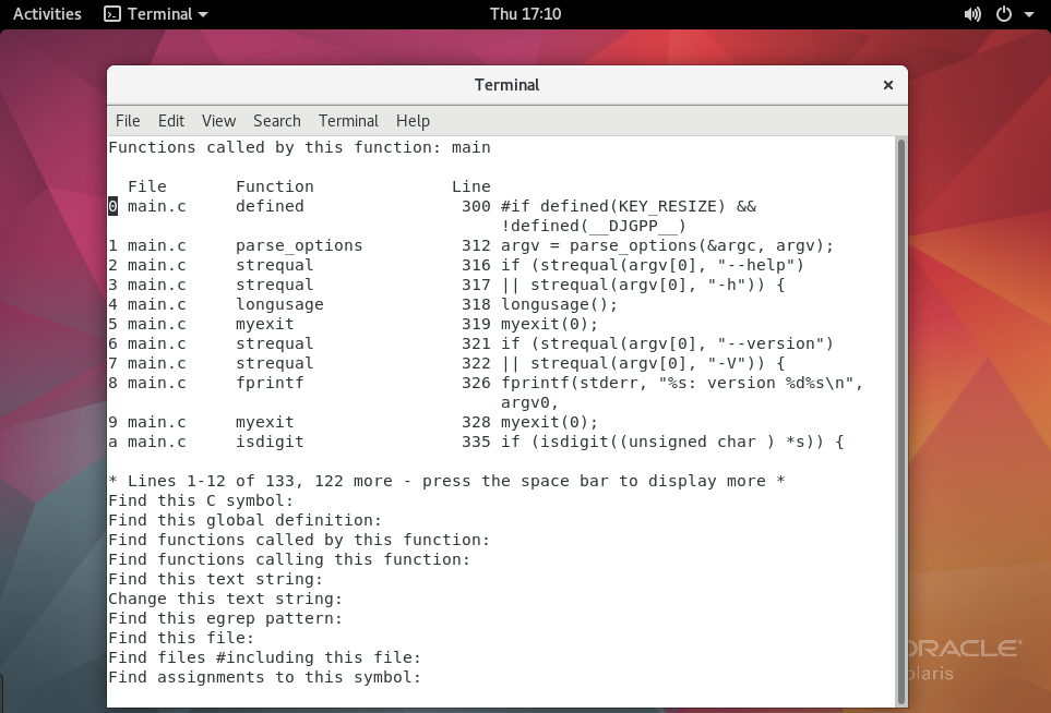So what’s the software? Well I use cscope a fair bit. Internally we have two versions cscope and cscope-fast. The former came to us when we licensed AT&T System V Unix, and we have evolved it ever since. The latter is a fork to optimise search speed (at the expense of it being slower to generate the index file). cscope-fast isn’t that good at doing python either, which I am doing a lot more of these days. I noticed that in 2001 SCO, who bought the rights to AT&T System V unix, had opensourced cscope under the BSD license, so thought it was worth seeing how it compared, both in terms of speed and how it handles python.