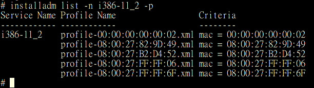 # installadm create-profile -n i386-11_2 -p profile-08:00:27:82:9D:49.xml -c mac=08:00:27:82:9D:49