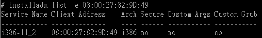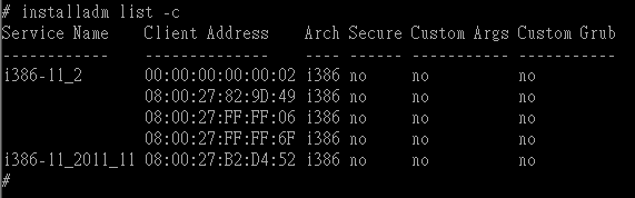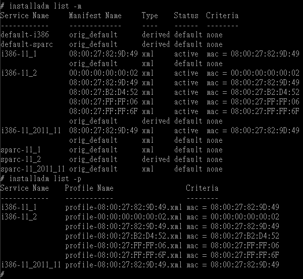 To associate this mac address to another install service, just execute “installadm create-client” again. Check out below example, 08:00:27:82:9D:49 was originally for i386-11_2, and after a new create-client command it finally belongs to i386-11_2011_11,
