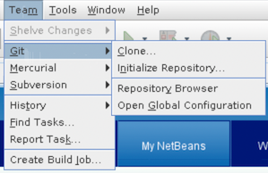 Once NetBeans has started we need to create a clone of the Git repository. We do this by going to Team -> Git -> Clone: