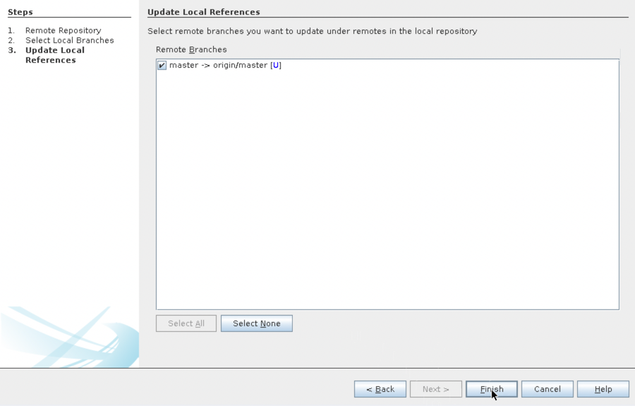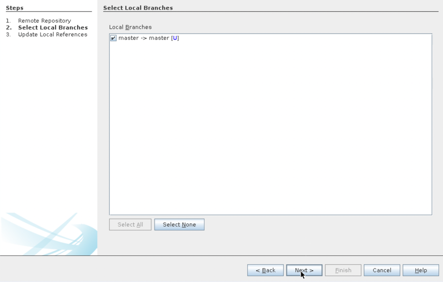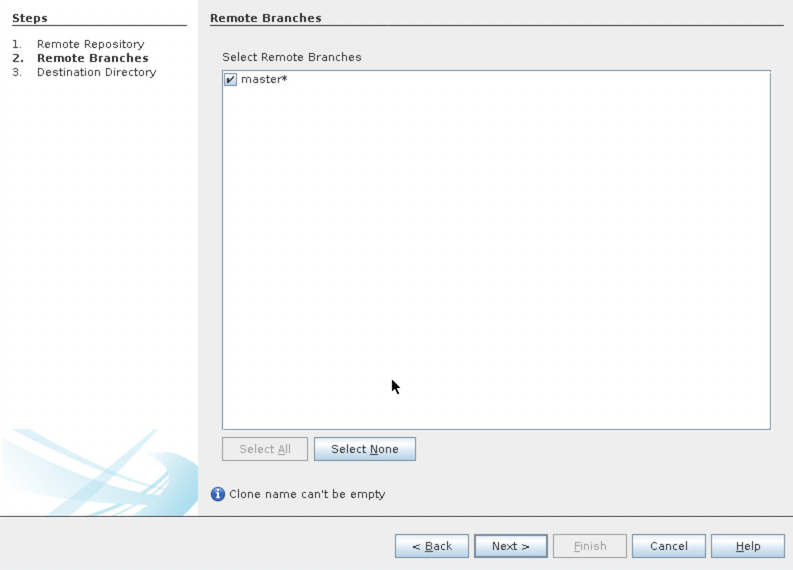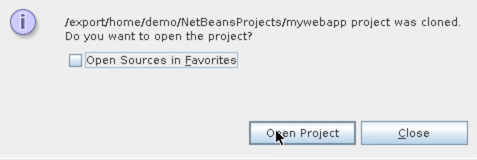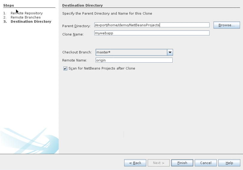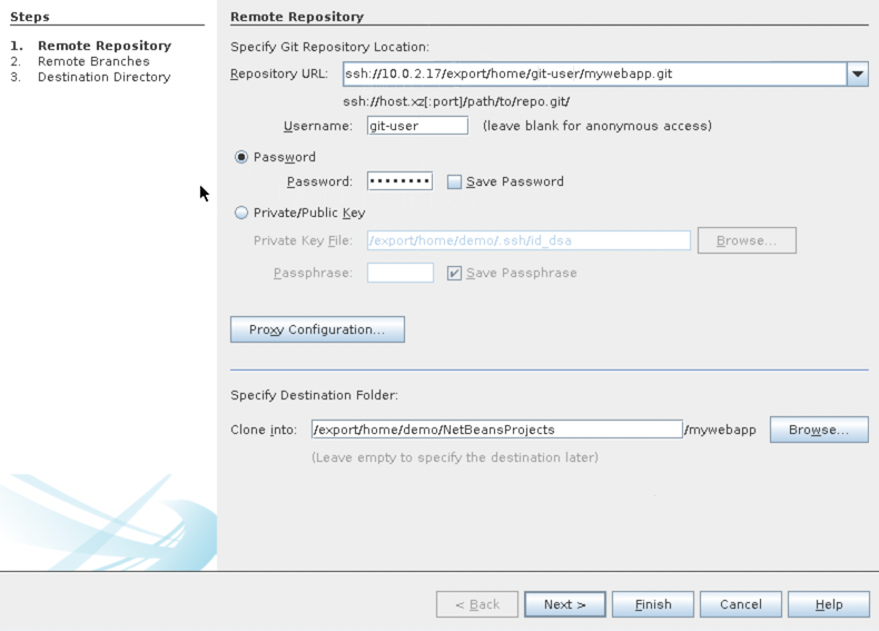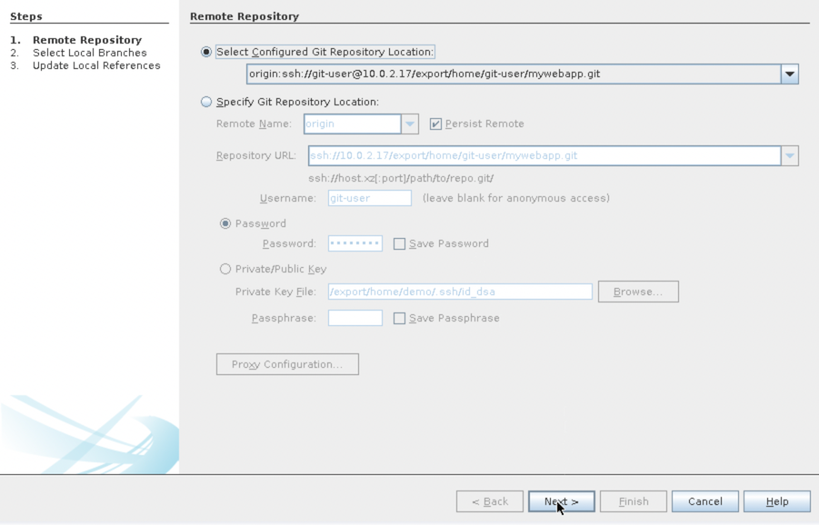 Which will ask the location of the repository. The location of the Git repository is in the j-m_zone, so use the IP address of the j-m_zone which in my case is 10.0.2.17. And I fill in “ssh://10.0.2.17/export/home/git-user/mywebapp.git” as the URL, “git-user” as the username and the corresponding password. Note you can choose to have NetBeans save the password if you want. Then click “Next>“: