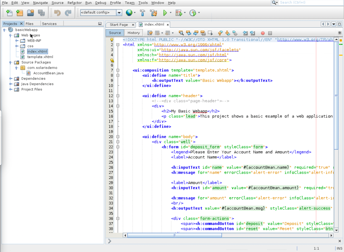 Now the left panel should show the “basicWebapp” project. Expand the project, locate the “index.xhtml” file and double click on it. This should open it in the right hand panel:
