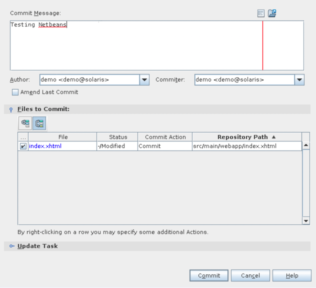 This will bring up a commit screen. Fill in the commit message, something like “Testing Netbeans“, and click “Commit“: