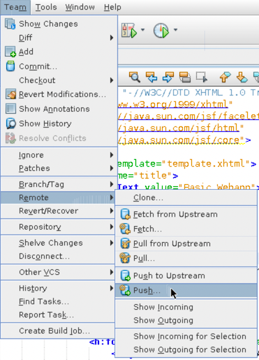 Now the change is committed to the local copy of the Git repository we can push the change to the origin repository. We do this by going to Team -> Remote -> Push… :