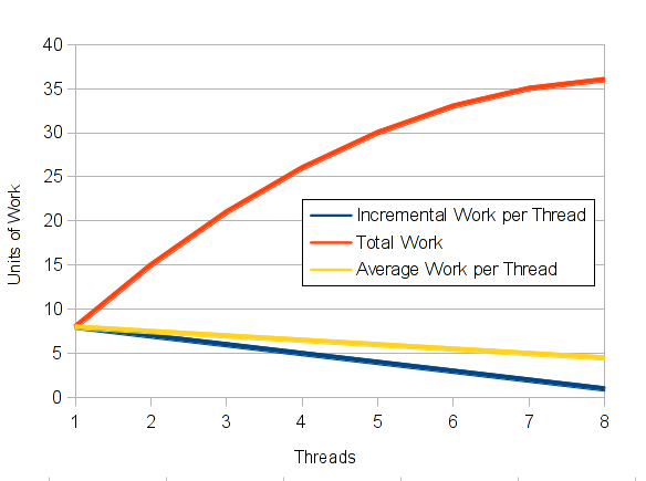 Es wird sehr deutlich, dass eine Abschaetzung der Single Thread Performance mit diesem einfachen Vorgehen nicht funktioniert.  Warum nicht?  Weil die heutigen CPUs alle multi-threading CPUs sind.  Sie haben nicht nur alle mehrere Kerne, die sich L2 oder L3 Caches und die Memory-Bandbreite teilen.  Sie haben darueber hinaus mehrere Threads, die sich einen Kern teilen.  Der Sinn dieser Threads liegt in einer hoeheren Kernauslastung:  Ein einzelner Thread ist nicht in der Lage, die modernen, schnell laufenden Kerne auch nur annaehernd auszulasten, hauptsaechlich weil die Memory-Latenz mit der Entwicklung der CPU-Taktraten nicht schrittgehalten hat.  Das bedeutet, dass ein zweiter, dritter oder vierter Thread in der Lage ist, zusaetzliche Arbeit zu verrichten ohne die anderen auf diesem Kern laufenden Threads wesentlich zu beeinflussen.  Natuerlich gibt es den Punkt, ab dem der Kern im Wesentlichen ausgelastet ist und daher die zusaetzliche Arbeit, die durch weitere Threads ausgefuehrt wird, mit zunehmender Threadanzahl abnehmen wird.  Das Diagram rechts stellt diesen Zusammenhang idealisiert dar.  Je nach Charakteristik der Rechenlast variiert die optimale Anzahl von Threads zwischen 1 und 8.  Das ist normal und im taeglichen Betrieb eines Rechenzentrums liefern diese CPUs daher hervorragenden Durchsatz.  Allerdings ist es fuer die Kapazitaetsplanung manchmal eine Herausforderung.  Im Falle einer Benchmark-Konfiguration fuer einen Durchsatz-Benchmark wie SPECint_rate2006 jedoch ist maximaler Durchsatz das einzige Ziel.  Daher sind auch die bspw. 2%, die ein weiterer Thread zum Gesamtergebnis noch beitraegt willkommen.  Durchsatz-Benchmarks wie SPECint_rate2006 oder SAP SD 2 Tier werden fuer maximalen Durchsatz optimiert.