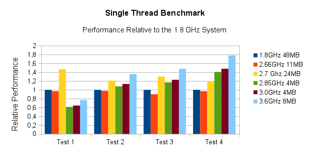 Das alles fuehrt letzten Endes zu der Erkenntnis: Single Thread Performance haengt in erster Linie von der Anwendung und den Daten ab – es gibt keine allein selig machende Antwort.  Das sollte natuerlich keine Ueberraschung sein, letztlich ist das bei jedem Benchmark so.  Bei der Bewertung von Single Thread Performance ist es jedoch besonders wichtig, da hier die Unterschiede besonders stark zu Tage treten.  Ein letzter Blick auf das obige Diagramm:  In Test 1 ist das 2.66 GHz System ca. 1/3 schneller als das 2.85 GHz System, und ungefaehr gleich schnell wie das mit 1.8 GHz.  Gemaess Tests 2 und 3 jedoch ist das 1.8 GHz System deutlich schneller als das 2.66 GHz System, aber alle anderen sind schneller als diese beiden.  Das Problem bei der ganzen Sache ist: Man weiss nie, welchen Fall man mit dem jeweils bevorzugten Testprogramm gerade erwischt.  Egal was man testet, egal wie die Resultate ausfallen, es ist zumindest sehr schwierig, damit Performancevorhersagen zu treffen.