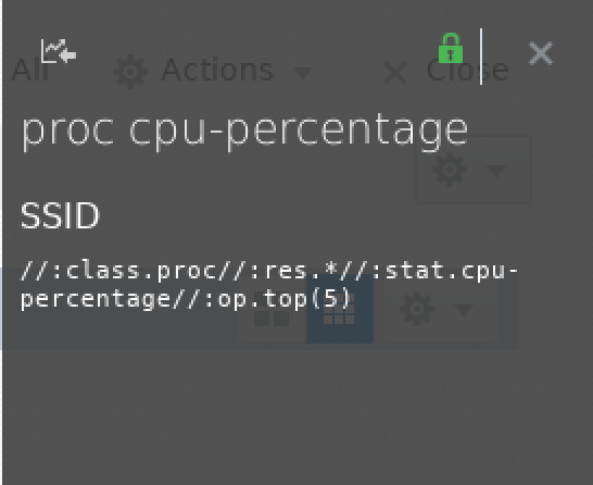 This shows the SSID of the data in this graph. A quick look at this show it’s looking in the process data //:class.proc, then it’s using a wildcard on the resources //:res.* which grabs all the entries available, then it selects the statistic for CPU usage in percent //:stat.cpu-percentage, and finally it does a top operation on this list and selects the to 5 processes //:op.top(5) (see ssid-op(7) for more info). And when I use this on the command line I get: