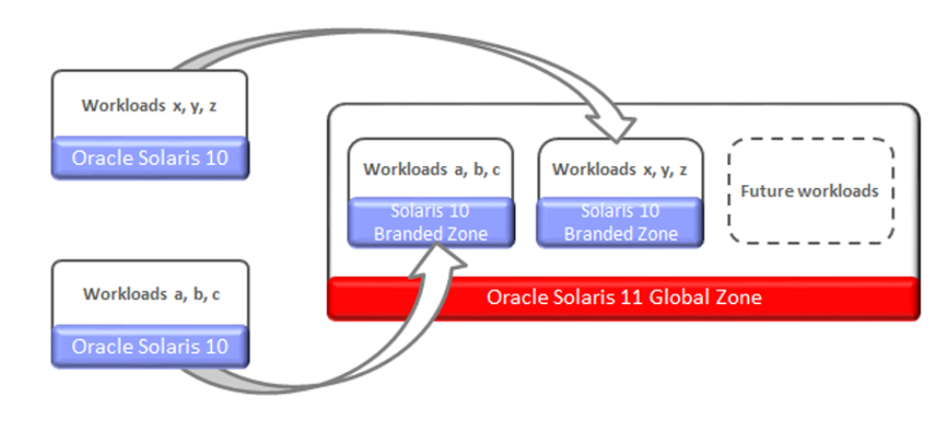 You can consolidate many workloads into Oracle Solaris 10 branded zones as shown below.