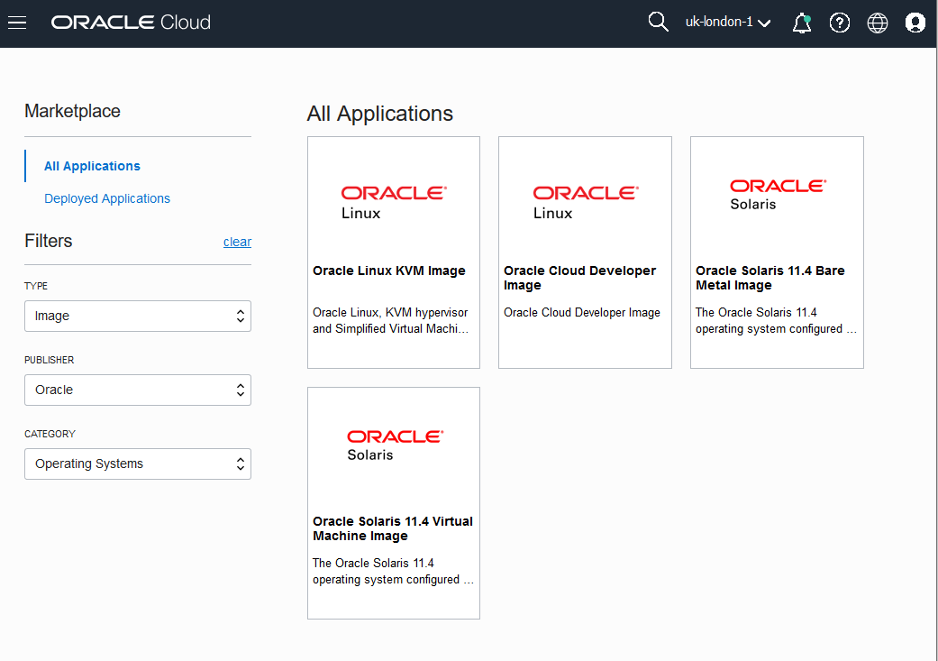 Using the Solaris images is very simple. In the OCI console, select the Marketplace item in the OCI console main menu. In the All Applications directory, you can use filters to help find the Oracle Solaris listings, as in this screenshot: